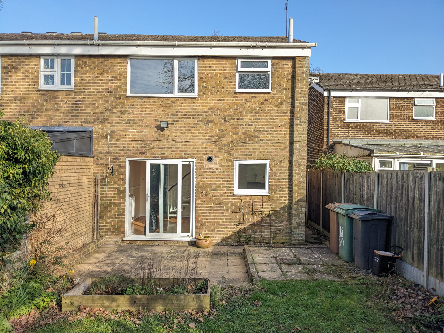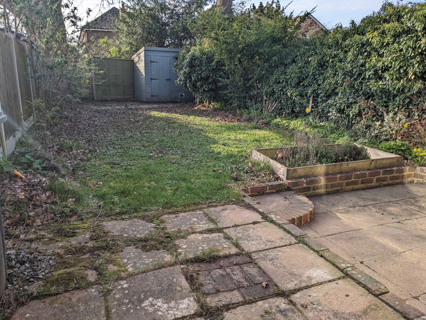 Sliding glass doors open onto the back garden with a patio area, shed and side gate for access.